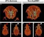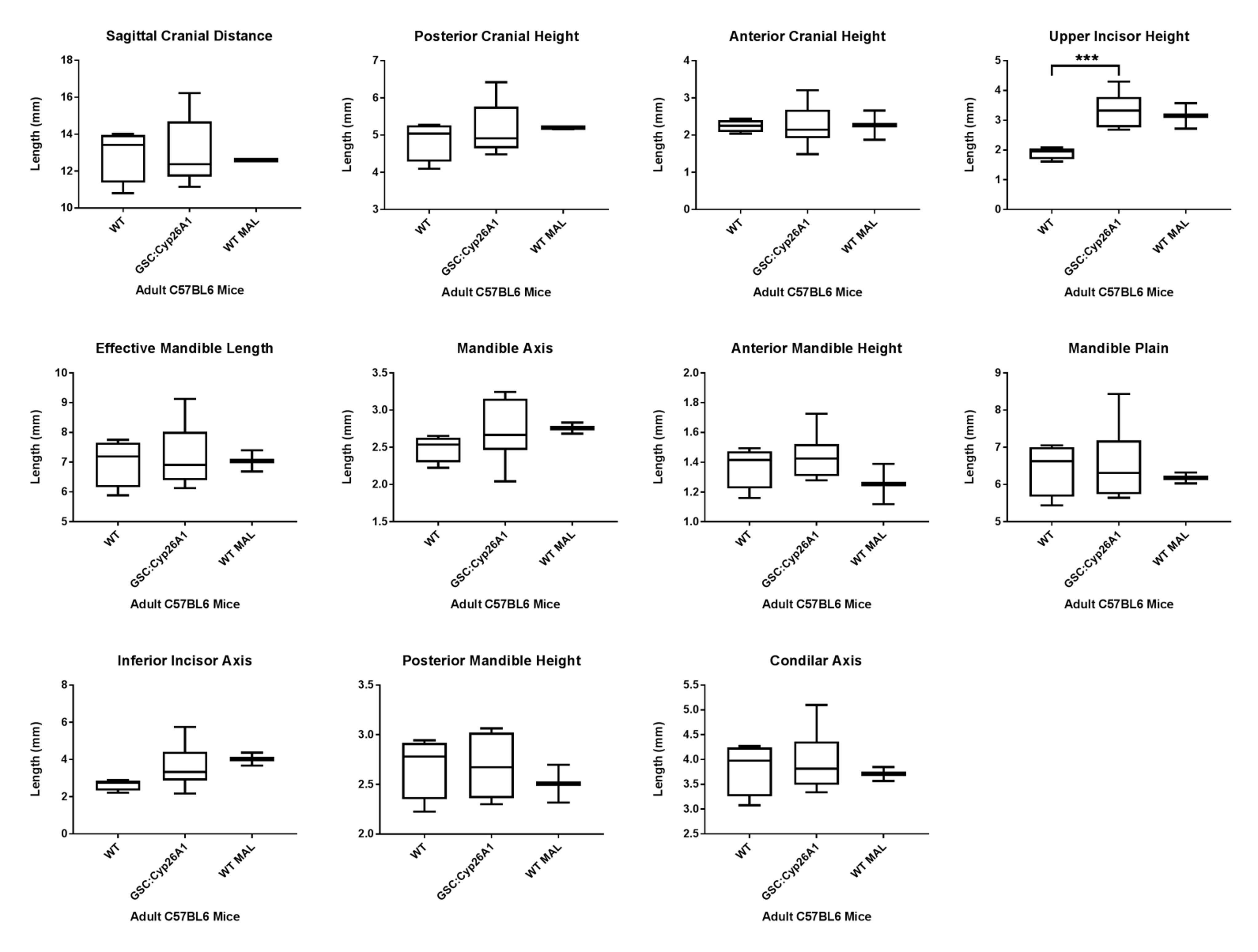 Supplemental Figure S1 | Gsc+/Cyp26A1 P60 mice have large upper incisors, but do not have any length or height variations in the cranium or mandible regions. Box plots for all height and length craniofacial landmark features are shown, as indicated. Gsc+/Cyp26A1 P60 mice were statistically different for only one measurement: the upper incisor height (upper right panel, P < 0.001). Trending results in the inferior incisor axis, posterior cranial height and mandible axis were observed in Gsc+/Cyp26A1 mice. Gsc+/Cyp26A1 mice, n = 10; C57BL/6N mice, n = 4; WT with spontaneous malocclusions, n = 3. ***P < 0.001. |