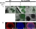 FIGURE 2. Gsc:Cyp26A1-eGFP is expressed in embryoid bodies induced with activin A and fibroblast growth factor (FGF). (A) Embryoid body (EB) formation was used to generate definitive endoderm germ cells in vitro. Activin A and FGF-2 were used to induce Gsc gene expression, including Cyp26A1-eGFP expression from the targeted Gsc allele. Results clearly demonstrate Gsc:Cyp26A1-eGFP is inducible under these conditions by eGFP expression in Activin A treated cells (middle panels), but not in untreated or EBs generated from wild-type ES cells (left and right panels, respectively). ES cell clones used to generate EBs are identified (C2, H4, G12). (B) Sox17 immunocytochemistry was performed on embryoid bodies to confirm definitive endoderm cell induction (Sox 17). Nuclear staining (DAPI) and overlay (MERGE) are shown. Scale bars: 200 um (A); 40 um (B). |