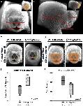 FIGURE 7. Gsc+/Cyp26A1 E18.5 embryos have Fetal Alcohol Syndrome (FAS)-like craniofacial malformations. (A) Landmark craniofacial measurements used for E18.5 embryo facial analysis. (Adapted from Anthony et al., 2010; Lipinski et al., 2012). E18.5 embryo SEM frontal pictures were used for Philtrum-Lip Ratio (1), Bigonial Line (2), Whisker Pad (3), and Snout Area (4) quantitative measurements. (B) E18.5 embryo SEM side-view pictures were used for Midfacial (5), Lower facial (6), Neck to Edge of Mandible (7), and Side Snout Area (8) quantitative measurements. Inset indicates the snout area (orange highlight). (C, E) Gsc+/Cyp26A1 E18.5 embryos have a less defined maxillary process resulting in a larger philtrum/philtrum-lip ratio compared to WT littermates (red arrow length/yellow arrow length). For comparison, WT littermates E18.5 embryos have a more defined, normal protruding maxillary formation resulting in a smaller philtrum/philtrum lip ratio. (D, F) Gsc+/Cyp26A1 E18.5 embryos have a narrower bigonial line width (red dashed line, asterisk marks the comparative length of Gsc+/Cyp26A1 bigonial line width on a WT sibling). (D) Whisker pad length measurement can be seen by the dark blue line, asterisk marks the comparative length of Gsc+/Cyp26A1 whisker pad length on a WT sibling (Table 4). (B, F) The orange overlay defines a smaller snout area in Gsc+/Cyp26A1 E18.5 embryos compared to WT sibling that has a larger snout area (Panel D, Table 4). Representative analysis of the most significant measurements are shown and box plots show data from litter 38 and 41, see Table 4 for litter measurement details. Scale bar = 4 mm. A t-test was used to determine statistical significance. * = p < 0.05. |