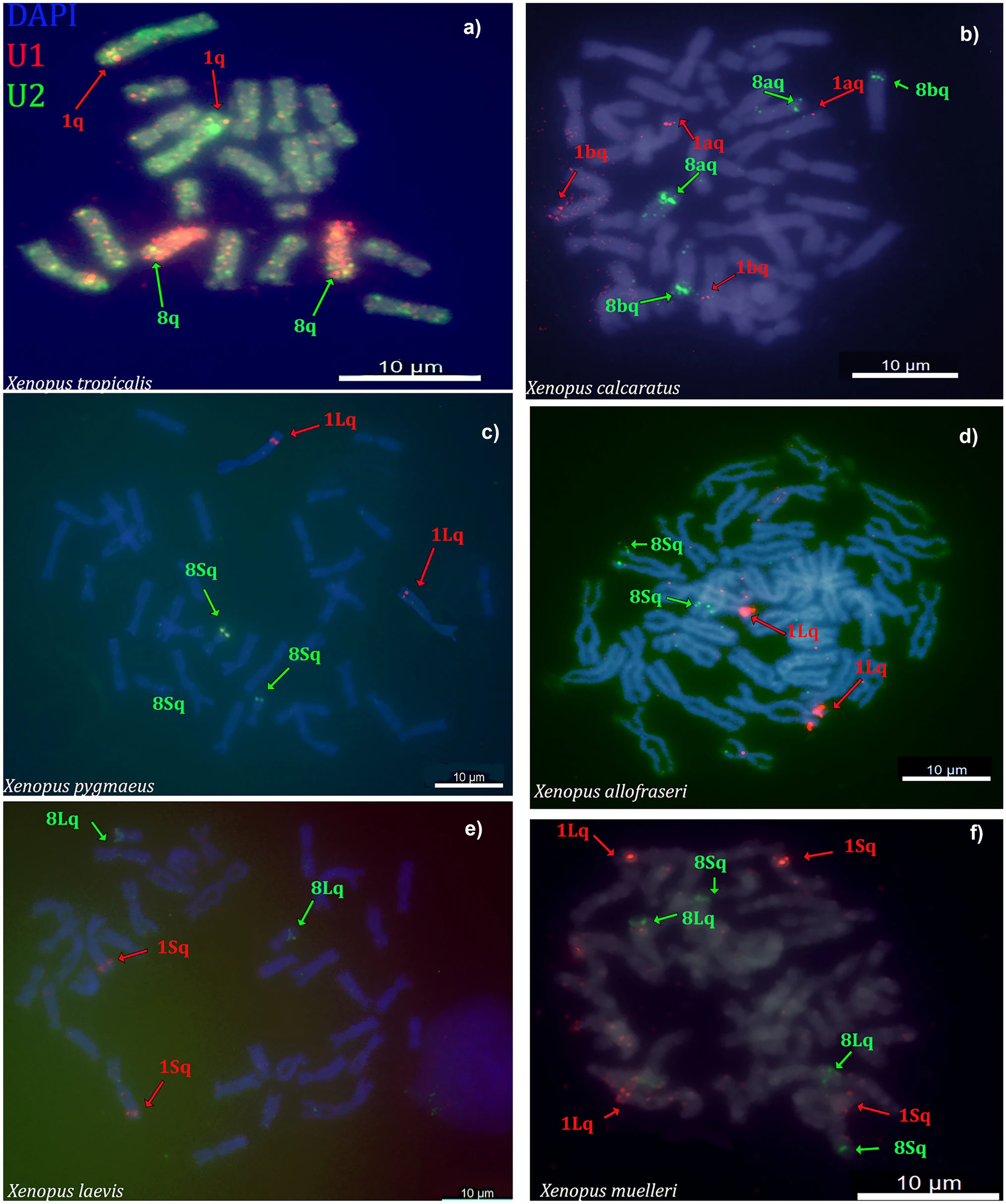 Double-color FISH with U1 and U2 snDNA probes. The U1 probe (red) reveals one clear signal (= a pair of homologous chromosomes) in a X. tropicalis, c X. pygmaeus, d X. allofraseri, and e X. laevis, while the same FISH shows two signals, each within homoeologous chromosomes in b X. calcaratus and f X. muelleri. The U2 (green) probe shows one signal in a X. tropicalis, c X. pygmaeus, d X. allofraseri, and e X. laevis, while the U2 probe shows two signals, each of them within homoeologous chromosomes in b X. calcaratus and f X. muelleri. Green and red arrows correspond to the U2 and U1 repeat loci, respectively. Painting probes were used for identification of chromosomes 1 (green) and 8 (red) in a X. tropicalis. Chromosomes were counterstained with DAPI in blue/gray. Scale bars represent 10 µM