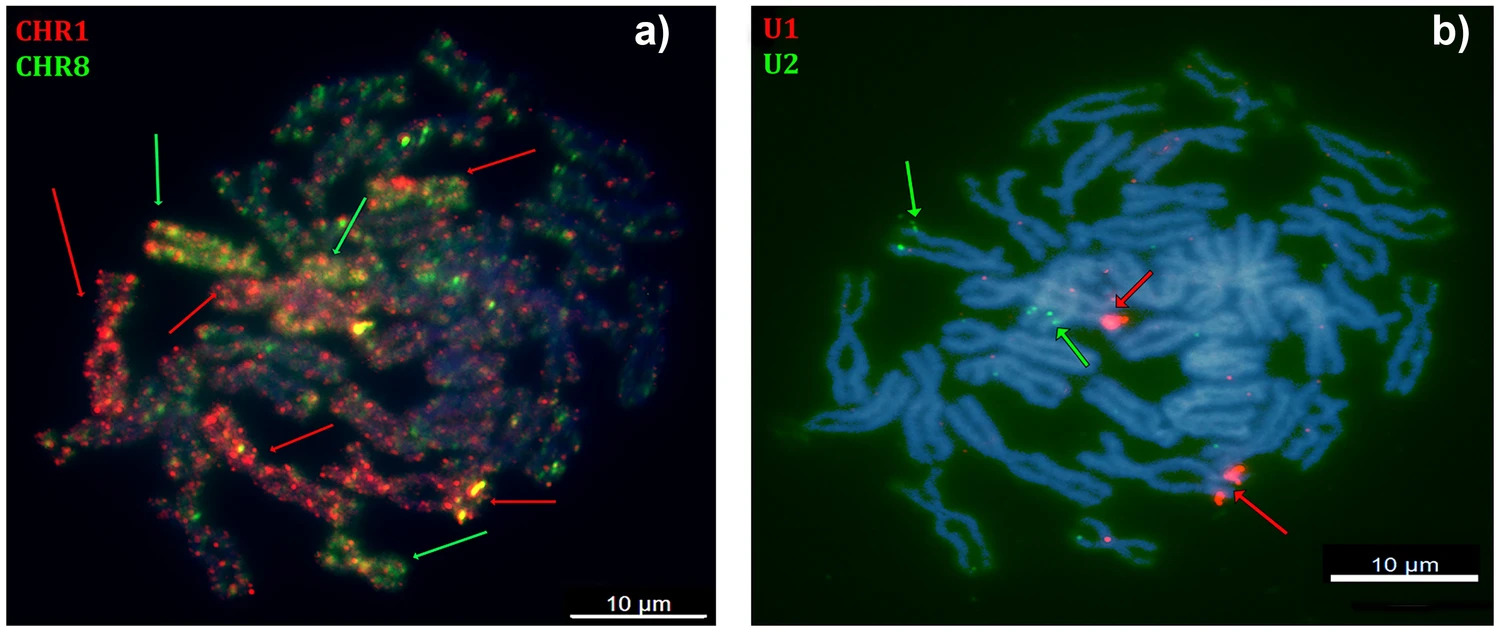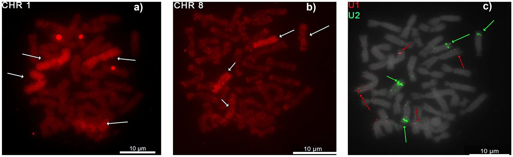 Sequential FISH in X. laevis chromosomes. Cross-species painting FISH experiments with whole chromosome painting probes from a XTR 1 (in red) and XTR 8 (in green) illustrate that b the U1 locus (in red) is localized on X. laevis chromosomes 1S (XLA 1S), and the U2 locus (in green) on XLA 8L. Both a and b are merged in the RGB channels. Chromosomes were counterstained with DAPI in blue. Scale bars represent 10 µM