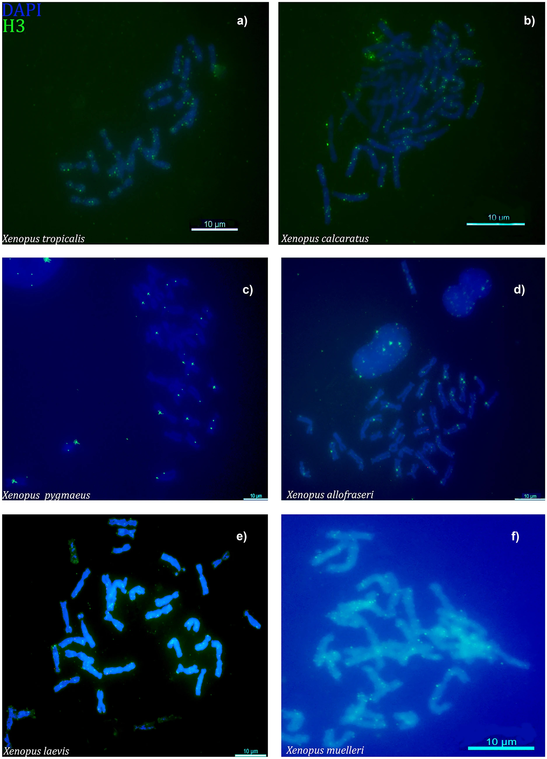 FISH with histone H3 probe. The probe (green) shows multiple signals in a X. tropicalis, b X. calcaratus, c X. pygmaeus, d X. allofraseri, e X. laevis, and f X. muelleri. Chromosomes were counterstained with DAPI in blue/gray. Scale bars represent 10 µM