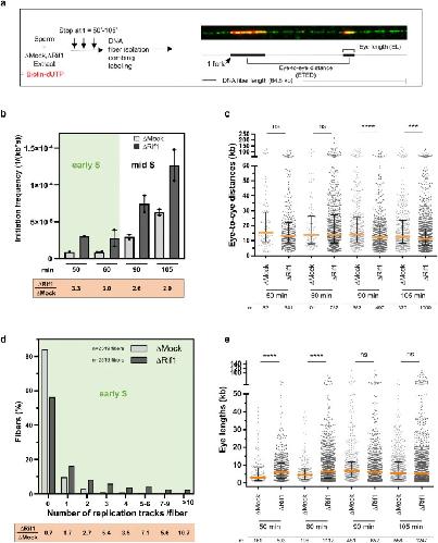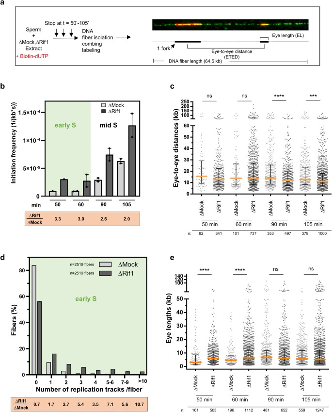 a Principle of DNA combing experiment with a fiber example and measured parameters. Sperm is replicated in control (∆Mock) or Rif1 immunodepleted (∆Rif1) egg extract in the presence of biotin dUTP, DNA was isolated at the indicated times, and then DNA combing was performed in two independent experiments. b Mean initiation frequencies (I(t)) with standard error of mean with SEM, n = 2 (data points) and ratio ∆Rif1/∆Mock (I(t)) were calculated. c Scatter dot plot of eye-to-eye distances (ETED) at different time points from replicate 1, median with interquartile range, Mann–Whitney test. d Percentage of unreplicated fibers and fibers with increasing number of replication tracks per fiber from early S phase from both independent experiments, with an equivalent fiber length distribution in mock and Rif1 depleted condition; percentage ratios indicated below each class. (n = 2519 fibers for each distribution, Mann–Whitney test on distribution, p value 4 × 10−41). e Scatter dot plot of eye lengths (EL), replicate 1, median with interquartile range, Mann–Whitney test; n indicated below, ns: non-significant, * indicates significant difference (Mann–Whitney U test, two-sided, p < 0.05: p values: * 0.01–0.05; ** 0.001–0.01; *** 0.0001–0.001; **** <0.0001).