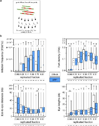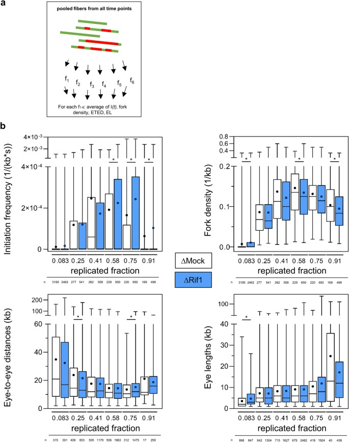a Principle of analysis: All DNA fibers were grouped into six classes according to their replicated fraction f1-f6. b Box and whisker plots for initiation frequency (I(f)), fork density, ETED and EL after Mock and Rif1 depletion for each replicated fraction class, with medians (black lines) and means (black points), upper and lower quartiles, min and max, n indicated below, * indicates significant difference, Mann–Whitney U test, two-sided.