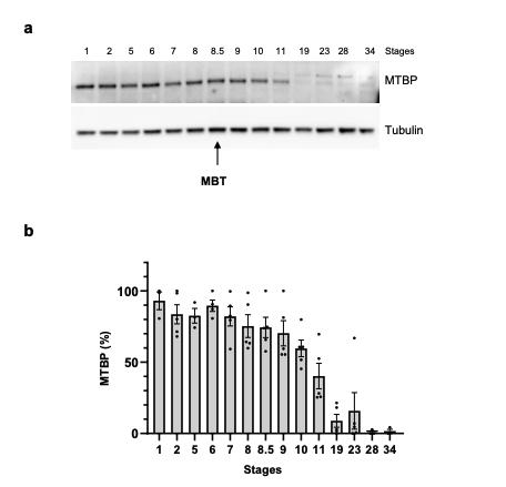loading control; MBT (mid-blastula transition). b quantification of MTBP abundance; three