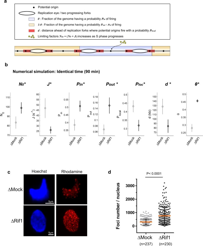 a Diagram of the numerical model41 with parameters described in the text. b Inferred model parameters by fitting ∆Mock and ∆Rif1 depleted combing data of two replicates for the same time interval (90 min). Circles indicate the mean value of the parameters over 100 different runs of the genetic algorithm; the error bars are standard deviations, (*) indicates a significant difference between the ∆Mock and ∆Rif1 samples, χ2 test. c Nuclei were incubated in Mock or Rif1 depleted extracts in the presence of rhodamine-dUTP and stopped early in S phase, representative images of nuclei by fluorescence microscopy. d Scatter dot plot of early replication foci number per nucleus, mean with SD, two-tailed Mann–Whitney test.