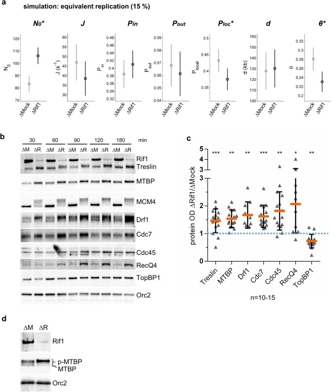 a Inferred model parameters by fitting ∆Mock and ∆Rif1 depleted combing data of two replicates at a comparable percentage of replication. Circles indicate the mean value of the parameters over 100 different runs of the genetic algorithm; the error bars are standard deviations, (*) indicates a significant difference between the ∆Mock and ∆Rif1 samples, χ2 test as described41. b Chromatin fractions after Rif1 or Mock depletion were isolated at indicated times and analyzed by western blot for indicated proteins. c Ratios of ∆Rif/∆Mock optical densities (OD) of western blot bands for indicated proteins from three independent chromatin experiments, normalized to Orc2-OD, scatter dot plot with mean and SD, including all time points (n = 10–15), one sample t-test. * indicates significant difference. d Phosphorylation of MTBP after Rif1 depletion, chromatin proteins were separated after 60 min using Anderson-SDS-PAGE to better resolve phosphorylated forms of MTBP42.