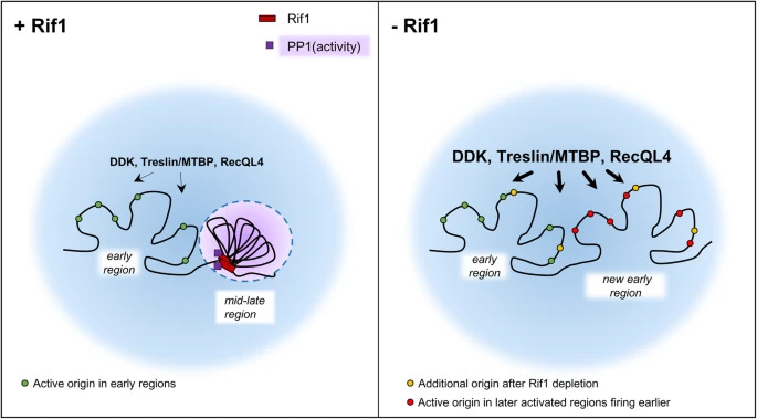 Rif1 orchestrates the temporal availability of initiation factors and PP1 in early Xenopus embryo’s DNA replication at the level of domains; for details, see text.