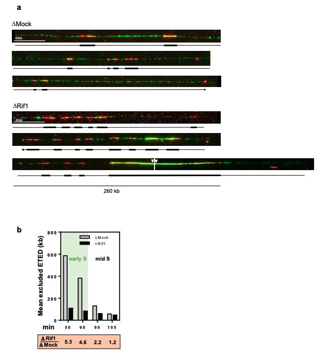 depleted conditions is a composed fiber of two consecutive microscope fields. b Mean excluded eyeto-eye distances (mean excluded ETED) from mock and Rif1 depleted extracts of experiment1;