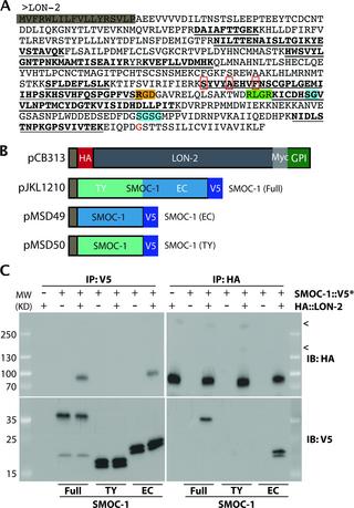 Fig 2. SMOC-1 interacts with LON-2 in worm extracts and in vitro. (A) Sequence of C. elegans LON-2 protein with peptide regions detected in the different IP/MS experiments marked. Peptides detected in the full-length SMOC-1::2xFLAG pulldown are underlined, while peptides detected in the SMOC-1(EC)::2xFLAG pulldown are in bold. Important regions of LON-2 are also highlighted, including the signal peptide (gray), RGD motif (orange), RLGR consensus putative furin protease recognition site (green), HS GAG attachment sites (aqua), and GPI linkage site (red). The 3 residues (S311, A315, and F319) in red boxes are predicted to mediate LON-2-SMOC-1 interaction and are mutated to generate the lon-2(mut) mutation described later. (B) Diagrams of the expression constructs used in the Drosophila S2 cell expression system. (C) Results of co-IP experiments testing the interaction of HA::LON-2 with different versions of SMOC-1::V5* produced in Drosophila S2 cells, including SMOC-1(Full)::V5, SMOC-1(TY)::V5, and SMOC-1(EC)::V5. IP with anti-V5 beads or anti-HA beads, IB with anti-HA or anti-V5 antibodies, as indicated. Experiments were independently repeated in triplicate, with representative results shown in this figure, and < points to faint bands that may represent glycosylated LON-2. We do not know whether posttranslational modification or cleavage causes SMOC-1 proteins to run as 2 bands when expressed in Drosophila S2 cells. Original images of western blots can be found in S1 Raw Images. co-IP, coimmunoprecipitation; EC, extracellular calcium-binding; GAG, glycosaminoglycan; HS, heparan sulfate; IB, immunoblot; IP, immunoprecipitation; SMOC, secreted modular calcium-binding protein; TY, thyroglobulin type-1. https://doi.org/10.1371/journal.pbio.3002272.g002 |