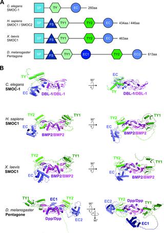 Fig 7. Structural modeling of interactions between SMOC and BMP homologs from both vertebrate and invertebrate species. (A) Diagrams of SMOC proteins from C. elegans, H. sapiens, X. laevis, and D. melanogaster, showing the unique arrangement of the TY and EC domains in each SMOC protein. (B) Predicted structures of complexes formed between homologs of CeSMOC-1 and mature DBL-1 from C. elegans, H. sapiens, X. laevis, and D. melanogaster. Predictions are similar between HsSMOC1 and HsSMOC2, but only HsSMOC1 is shown here. Predictions are also similar between BMP4 and BMP2 for H. sapiens and X. laevis SMOCs, but only BMP2 is shown here. Note that each of the BMP ligands is predicted to make a similar interaction with a TY domain of its corresponding SMOC-1 homolog. The interaction with the C-terminus of the EC domain appears to be somewhat less conserved, as it is present in X. laevis and D. melanogaster predictions, but not in the H. sapiens predictions. However, H. sapiens SMOC1 appears to replace the EC domain interaction with a portion of the SMOC1 polypeptide located in between the 2 TY domains. This additional interaction involving the linker in between TY domains is also found in the prediction of the X. laevis complex. The SMOC-1 homologs from H. sapiens, X. laevis, and D. melanogaster each contain 2 TY domains, and in each prediction both domains make a similar contact with each of the 2 BMP molecules in the BMP dimer. BMP, bone morphogenetic protein; EC, extracellular calcium-binding; FS, follistatin-like; SMOC, secreted modular calcium-binding protein; TY, thyroglobulin type-1. https://doi.org/10.1371/journal.pbio.3002272.g007 |