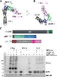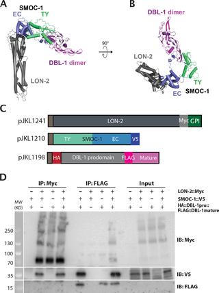 Fig 8. Co-IP results testing the model for tripartite complex formation. (A) Predicted structure of a complex formed between LON-2, SMOC-1, and a homodimer of the DBL-1 mature domain. The membrane-anchoring region of LON-2 lies at the bottom of the panel. (B) The same structure prediction as in A, but shown from the “top.” (C) Diagrams of LON-2, SMOC-1, and DBL-1 expression constructs used in the Drosophila S2 cell expression system. (D) Results of co-IP experiments testing the interaction between LON-2::Myc and HA::DBL-1 prodomain::FLAG::DBL-1 mature domain in the presence or absence of SMOC-1::V5. IP with anti-FLAG beads, or anti-Myc beads, and IB with anti-Myc, anti-V5 or anti-FLAG antibodies, as indicated. Note that immunoprecipitation of FLAG::DBL-1mature domain with anti-FLAG beads can pull down LON-2::Myc only in the presence of SMOC-1::V5. No FLAG::DBL-1mature protein was detected when IP was performed using anti-Myc antibodies, very likely due to the low amount of FLAG::DBL-1mature protein in the co-IP experiments, as FLAG::DBL-1mature protein was not detectable in the Input lanes where approximately 1% of materials used for the co-IP experiments were loaded. Experiments were independently repeated in triplicate, with representative results shown in this figure. Original images of western blots can be found in S1 Raw Images. co-IP, coimmunoprecipitation; EC, extracellular calcium-binding; IB, immunoblot; IP, immunoprecipitation; SMOC, secreted modular calcium-binding protein; TY, thyroglobulin type-1. https://doi.org/10.1371/journal.pbio.3002272.g008 |