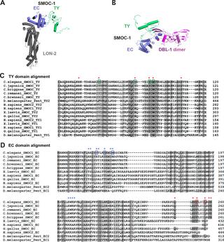 Fig 6. Structural modeling of interactions between SMOC-1 and LON-2, and between SMOC-1 and DBL-1. (A) Predicted structure of a complex formed between LON-2 and SMOC-1. The EC domain of SMOC-1 is predicted to interact with LON-2. (B) Predicted structure of a complex formed between SMOC-1 and a homodimer of the DBL-1 mature domain. Both the EC and TY domains of SMOC-1 are predicted to interact with DBL-1. (C) Multiple sequence alignment of the TY domains of SMOC-1 homologs using Clustal Omega (CLUSTAL O(1.2.4)). Red * marks the residues at the interface between SMOC-1 and DBL-1, as identified via ColabFold. Green colored boxes indicate residues (Y72, Y90, Y95, W97) mutated to generate the SMOC-1(M3) mutation. (D) Multiple sequence alignment of the EC domains of SMOC-1 homologs using Clustal Omega (CLUSTAL O(1.2.4)). Red * marks the residues at the interface between SMOC-1 and DBL-1, and blue * marks the residues at the interface between SMOC-1 and LON-2, as identified via ColabFold. In both C and D, dark shaded residues are identical, while light shaded residues are conserved, among all or most of the homologs. Blue colored boxes indicate residues (S152, S156, M160) mutated to generate the SMOC-1(M1) mutation, while red boxes indicate residues (F253, L257) mutated to generate the SMOC-1(M2) mutation. EC, extracellular calcium-binding; SMOC, secreted modular calcium-binding protein; TY, thyroglobulin type-1. https://doi.org/10.1371/journal.pbio.3002272.g006 |