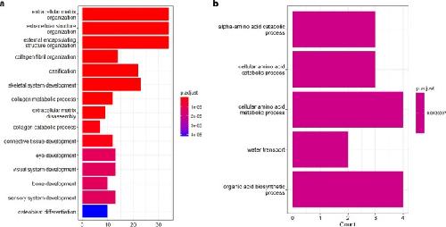 Figure 3. GO analysis of up- or down-regulated genes of DEG4. GO analysis of upregulated genes (a) or downregulated genes (b). Bar plots represents number of genes involved in each term. Adjusted p-value was represented by color scale, and the statistically significance level decreased from red (higher significance) to blue (lower significance).