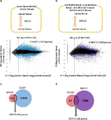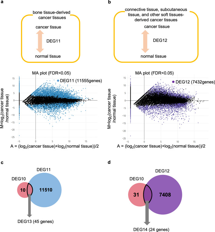 Figure 6. MA plot comparing gene expression pattern of cancer tissues with that of normal tissues in human. (a,b) MA plot of cancer tissue vs normal tissue derived from bone tissue (a) and connective tissues, subcutaneous tissue, and other soft tissues (b) in human. Blue (a) and purple (b) dots indicate DEGs with statistical significance (FDR < 0.05). (c,d) Venn diagram of the extraction of DEG13 (c) and DEG14 (d).