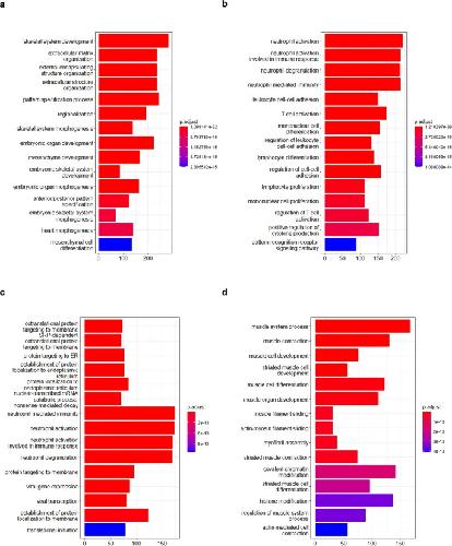 Figure 7. GO analysis of DEG11 and DEG12 genes. (a,b) GO analysis of upregulated genes (a) or downregulated genes (b) of DEG11. (c,d) GO analysis of upregulated genes (a) or downregulated genes (b) of DEG12. Bar plots represents number of genes involved in each term. Adjusted p-value was represented by color scale, and the statistically significance level decreased from red (higher significance) to blue (lower significance).