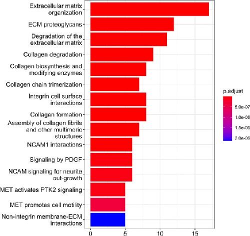 Figure 8. Reactome Pathway Analysis of genes of DEG10. Bar plots represents number of DEGs involved in each term. Adjusted p-value was represented by color scale, and the statistically significance level decreased from red (higher significance) to blue (lower significance).