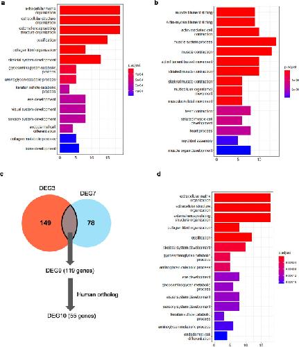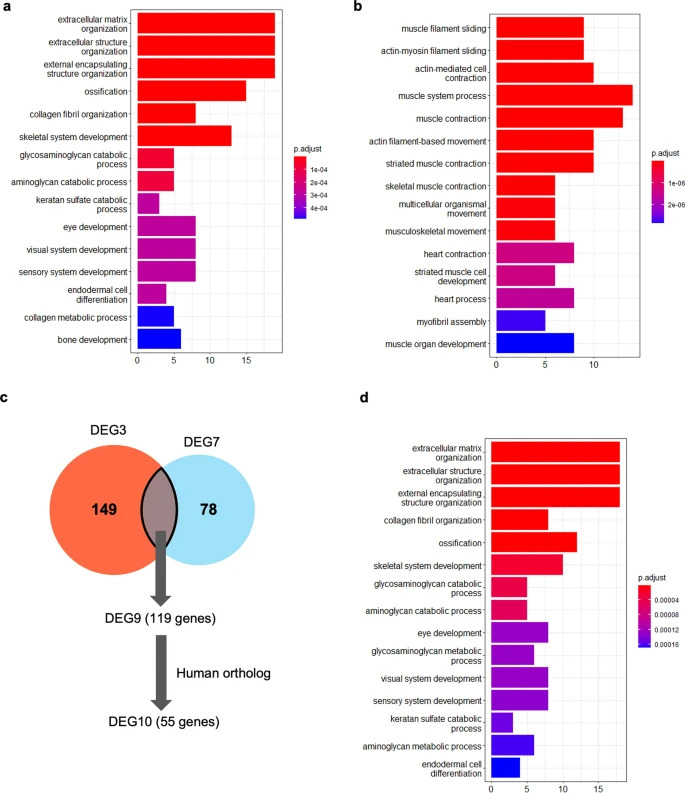 Figure 5. GO analysis of DEG8 and DEG10 genes. GO analysis of upregulated genes (a) or downregulated genes (b) of DEG8. Bar plots represents number of genes involved in each term. Adjusted p-value was represented by color scale, and the statistically significance level decreased from red (higher significance) to blue (lower significance). (c) Venn diagram showing DEG9, which is common genes of DEG3 and DEG7. (d) GO analysis of upregulated genes of DEG10.