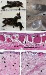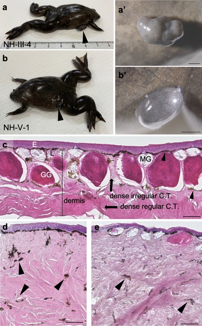 Figure 1. External view and histological analysis of X. tropicalis tumors. (a,b) External view of NH-III-4 and NH-V-1 tumor individuals. Arrowheads indicate the tumors. (a’,b’) Enlarged view of the tumors. Scale bar indicates 2 mm (a’,b’). (c) Histological analysis of normal tissue, stained by HE. Skin is composed of the epidermis (E) and dermis, which is subdivided into the dense regular connective tissue (C.T.) (arrow), dense irregular C.T. (arrow) and loose C.T. (L). Arrowheads indicate the pigment. The pigment adjacent to the epidermis is commonly referred to as the chromatophore. GG, granular gland; MG, mucous gland. (d,e) Histological analysis of tumors of NH-III-4 (d) and NH-V-1 (e). Arrowheads in (d,e) indicate the pigment. Scale bar indicates 100 μm (c–e).