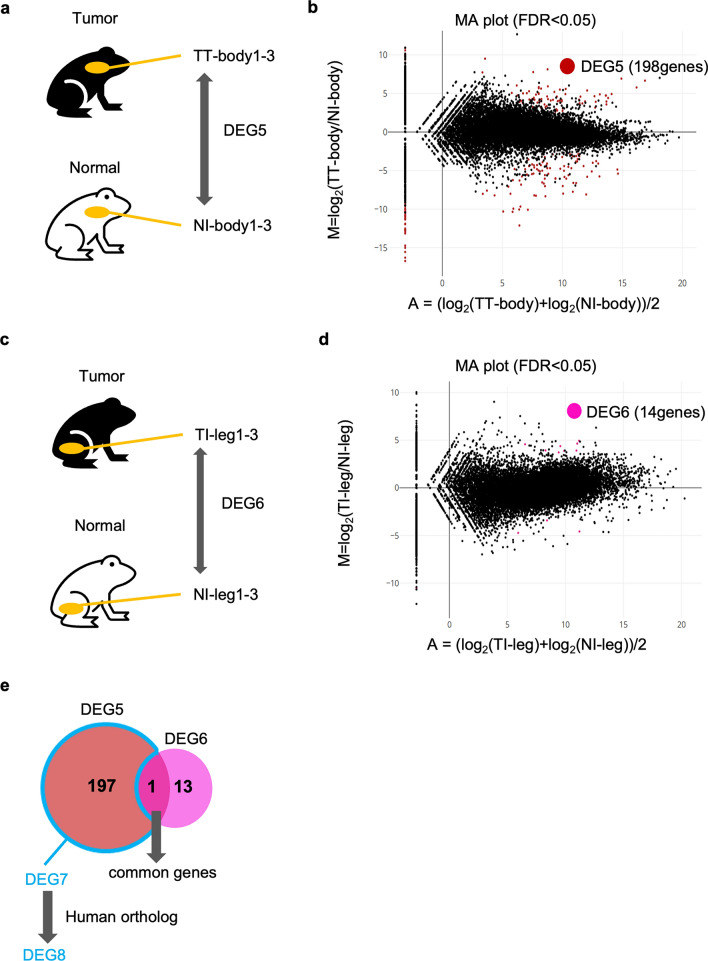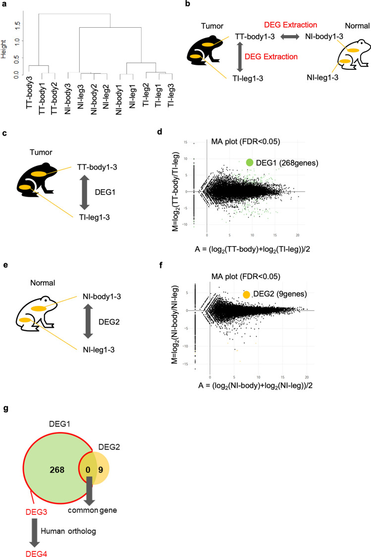 Figure 2. Hierarchical clustering of all analyzed tumors in Xenopus and DEGs of TT-body1-3 vs TI-leg1-3. (a) Hierarchical clustering of 12 analyzed samples. Difference of the expression patten among the samples was indicated with a tree diagram. (b) Schematic diagram of extraction of differentially expressed genes (DEGs) in Xenopus, which we analyzed in this study. (c,d) Schematic diagram of DEGs extraction (TT-body1-3 vs TI-leg1-3) (c) and the MA plot (d). Green dots indicate DEGs with statistical significance (FDR < 0.05) in (d). (e,f) Schematic diagram of DEGs extraction (NI-body1-3 vs NI-leg1-3) (e), and the MA plot (f). Orange dots indicate DEGs with statistical significance (FDR < 0.05) in (f). (g) Venn diagram showing DEG3. DEG3 is DEG1—DEG1 ∩ DEG2.
