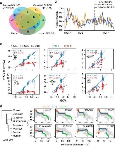 Fig. 3: Cis-regulatory innovation leads to the gain of 5' end Type I sites in higher animals. a Venn diagram showing the overlaps of Type I sites identified in wild-type HeLa cells and NSUN2 knockout HeLa cells expressing human, mouse, and zebrafish NSUN2 individually. Only sites that are covered by at least 20 reads in all samples were analyzed. The number of Type I sites overlapped with HeLa or human NSUN2 against the total number of Type I sites methylated by mouse or zebrafish NSUN2 was shown in parentheses. b The distribution of Type I m5C sites in NSUN2 knockout HeLa cells expressing human, mouse, and zebrafish NSUN2 individually. The density was first calculated as in Fig. 1d and then normalized to the bin with the highest density. c The relationship between maternal m5C density and GC content of the transcriptome. In this analysis, each maternal m5C site was binned as in Fig. 1d and the m5C density and GC content of each bin was calculated and plotted. Type I and Type II sites were calculated separately and Pearson correlation coefficient of determination is indicated. d Metagenomic analysis of GC contents in different species. With the investigation of more representative vertebrate species, we found that the 5' end high GC content was obtained in the common ancestor of birds and mammals. Source data are provided as a Source Data file. |