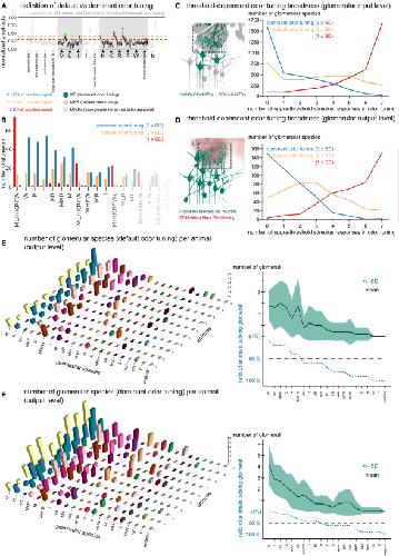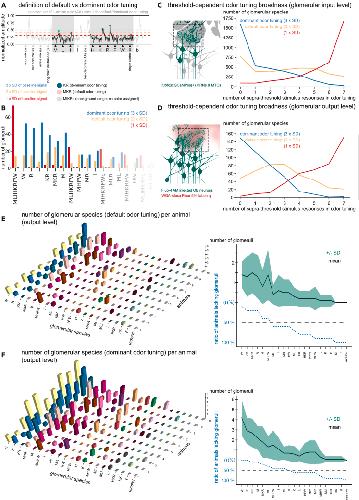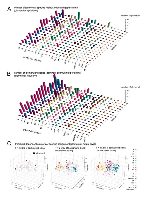 Figure S3. Lack of stereotypy in glomerular species numbers on the glomerular input level, Related to Figure 2 (A, B) 3D bar plots of numbers of glomerular species between the animals according to their default or dominant odor tuning based categorization. Numbers of glomerular species (input level, z-axis) of 21 frequent (dominant) odor tunings (x-axis) plotted for each animal (y-axis). (C) Amplitude difference-based 3D odor space representation of glomeruli of the output level (spheres, x, y, z position in space: details see methods section and Figure S1A) with an additional assignment of odor tuning (colors) depending on the response threshold used (1x, 2x, or 3x SD of baseline/background fluorescence signal) |