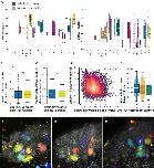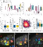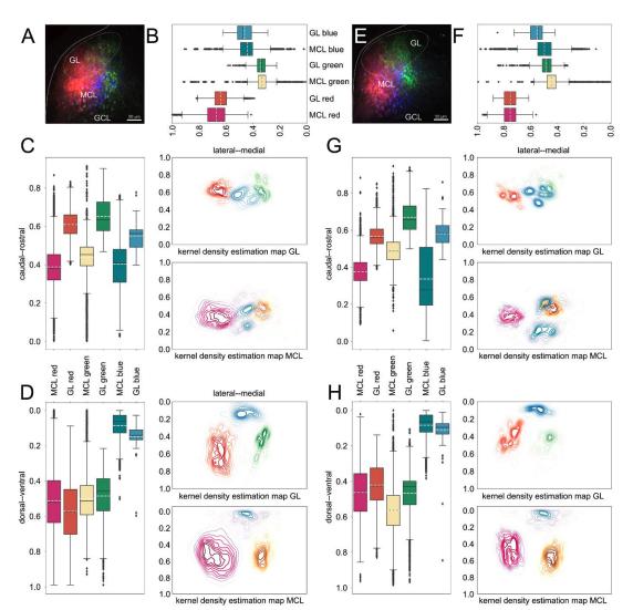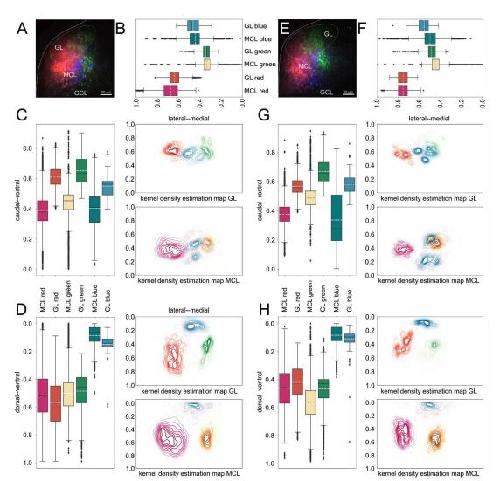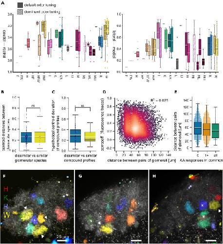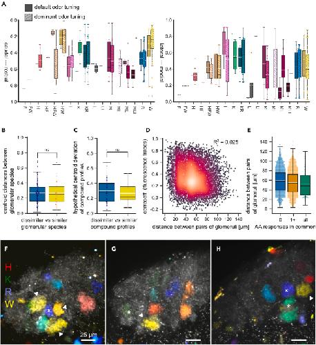 Figure 3. Glomeruli in the lateral cluster are positioned non-chemotopically, but individual glomerular species feature a positional bias(A) Boxplots of relative positions of glomerular species along the caudo-rostral (left panel) and medio-lateral axis (right panel) of the lateral olfactory bulb. Shading of boxes indicates odor tuning (darker shades) and dominant odor tuning (lighter shades, striped).(B) Comparison of inter-centroid distances between paired glomerular species of similar (yellow, combinations of H, F and W, K, R or M, L, I) and dissimilar (blue) amino acids.(C) Positional deviation of glomerular species with compound profiles (dominant odor tuning to two or three stimuli, e.g., HFW) from the hypothetical centroid of glomerular species tuned to corresponding single amino acids only (e.g., H, F, and W). Comparison between positional deviation from the centroid of glomeruli with compound profiles to structurally similar amino acids (yellow) and glomerular species of all remaining combinations of compound profiles (blue).(D) Interglomerular distance plotted against the correlation coefficient between time traces of all glomerular pairings (density indicated by color gradient purple to orange; n = 10). Lack of linear positive or negative relation (R 2 = 0.025) confirmed by OLS testing H0: regression slope = 0).(E) Comparison of distance between glomeruli based on common tuning (blue, no common stimulus; orange, at least one common stimulus; green, all stimuli in common). Mean, dashed white line; median: black line; box outlines 1st and 3rd quartiles; ns, not significant, p > 0.05.(F–H) Examples of variable glomerular organization in different individuals. Sections of the lateral glomerular cluster with intensity difference map-based representations of glomerular output level activity to the amino acids H, K, R, and W (red, green, blue, yellow). The juxtaposition of glomeruli responsive to W (white arrowheads) and glomeruli responsive to structurally dissimilar amino acids R (white cross) or K (white asterisk) is highlighted. All glomeruli were labeled with wheat germ agglutinin (gray). Scale bar equals 25 µm. See also Figures S4–S6. |
