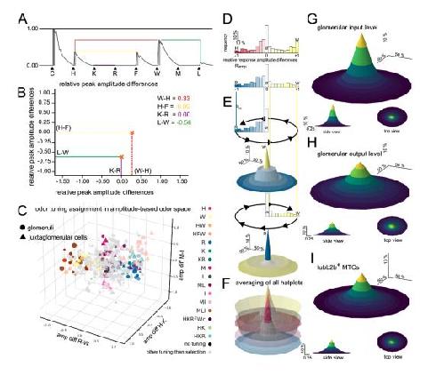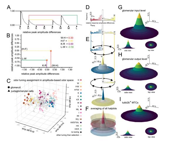 Figure S2. Overall tuning broadness to single amino acids is narrowed from the input to the glomerular output and MTC level, Related to Figure 1 (A, B) Schematic of amplitude differences calculation for individual fluorescent time traces and use of amplitude differences as axes for 2D/3D odor space representation. Position of responsive region (orange cross) in 2D odor space using two pairings of response peak amplitude differences (K-R, magenta and L-W, orange or W-H, red and H-F, yellow). (C) 3D odor space representation of individual glomeruli and JGCs of the output level defined by the three chosen amplitude difference axes R-W, H-K, and M-I (glomeruli: colored spheres; JGCs: colored triangles; diameter scaled to glomerular cross-sectional area). Colors assigned to individual (dominant) odor tunings see legend or Figure 2. (D) Distribution of all glomerular regions (output level) according to their amplitude differences to two amino acid stimuli (H: red and W: yellow bars upper panel or R: blue, W: yellow lower panel). (E) 3D hat-shaped representation of amplitude difference distributions ranging from 0 to -1 (blue shades) or 0 to +1 (yellow shades), hat tip color indicates the stimulus used for amplitude difference calculation. (F) Schematic of averaging all possible 3D representations of amplitude differences distribution. (G, H, I) Averaged 3D representations of amplitude difference distributions of the glomerular input (H), glomerular output (I), and tubb2b+ MTC level (J). The individual concentric rings of the ‘hats’ represent frequency bins of response amplitude differences. The frequency values are plotted along the z-axis and colorcoded (dark blue to lime). |