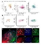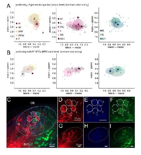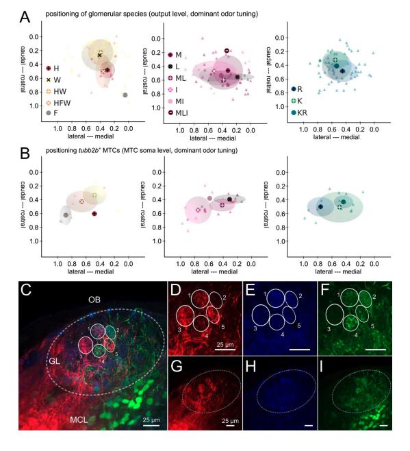Figure S5. MTC tufted dendrites innervate distinct glomerular units among the seemingly unparcellated lateral cluster, Related to Figure 3 (A, B) 2D projection of positioning of output level glomerular species (A) and tubb2b+ MTC somata (B) along the medio-lateral and caudo-rostral axes, grouped by dominant odor tuning. Positional variability of the individual glomerular species/MTC somata plotted as an ellipse in the dimensions of the standard deviation from the centroid of the data points (darker shaded circle). (C) Example of differential staining of MTCs using Calcein Red in the lateral (red), Calcein Violet in the intermedio-ventral (blue), and Calcein Green in the medial MCL (green). (D, E, F) Section of the lateral cluster with differential innervation of individual glomeruli (white numbered ellipses) by differently colored postsynaptic dendritic arborizations (C, composite image; D, Calcein Red, E, Calcein Violet; F, Calcein Green). (G, H, I) Projections from the lateral (red), intermediate (blue), and medial (green) MCL were biased to the lateral, intermediate, and medial glomerular layer, respectively. |