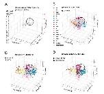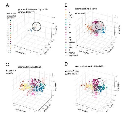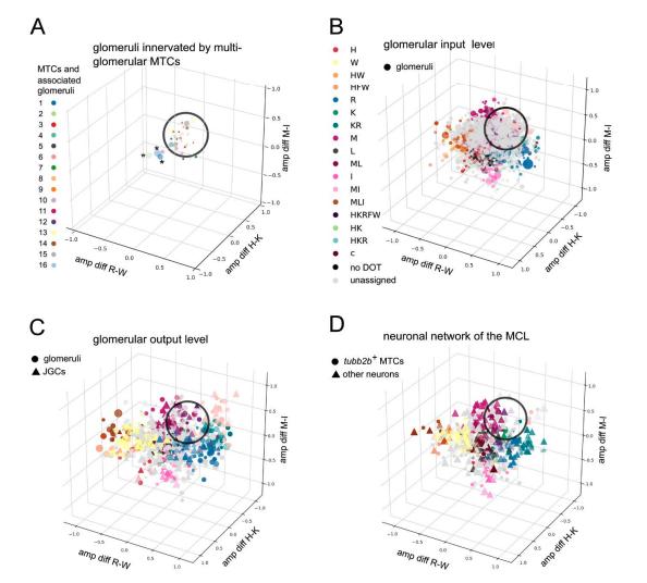 Figure S7. Response amplitude difference-based 3D odor space representations of the multiple levels of OB odor processing, Related to Figure 7 (A) Focal cluster of glomeruli innervated by multi-glomerular MTC (grey circle) in 3D odor space representation. Colors represent association to individual MTCs (left legend) and glomeruli of ‘deviant MTCs’ 1 and 2 (Figure 6) are labeled with asterisks. (B) Odor space representation of glomerular input level dataset. Glomeruli are additionally assigned a color of dominant odor tuning (see left legend). Highlighted odor space section densely packed with glomeruli of broader amino acid tuning (grey color: unassigned dominant odor tuning). (C) More widely spread distribution of glomeruli (circles; JGCs: triangles) of the output level in 3D odor space (see also Figure 1 and S2, higher fraction of selectively tuned glomeruli). Densities of glomeruli with similar tuning/odor space clustering as glomeruli innervated by multi-glomerular MTCs (grey circles) are lower on glomerular output and (D) MTC soma level (circles: tubb2b+ MTCs, circles: all neurons in MCL proximity) |