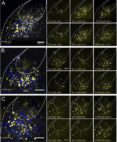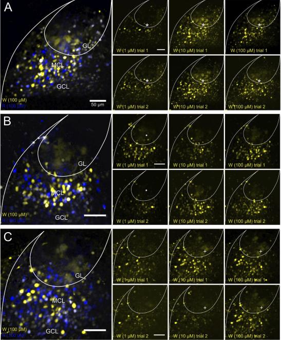 Figure S8. Maximally activatable glomerular ensembles to single amino acids stabilize at higher odor concentrations, Related to Figure 1 Intensity difference maps (maximum projections) of three different lateral OBs to R (blue) or W (yellow). Left, big panels: composite image of odor representations (intensity difference maps) to W and R at 100 µM stimulus concentration. Right small panels: Intensity difference-based odor maps to W applied at 1, 10 and 100 µm respectively (left to right) performed in two trials (upper vs. lower row). (A) animal with lack of glomerular odor representation to W at 1 µM concentration vs stable representations in the glomerular layer from 10 µM on (white asterisks). (B, C) Higher inconsistencies in maximally activatable glomerular ensemble by W at 1 µM (white stars) and even 10 µM concentrations (white crosses). |