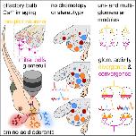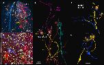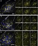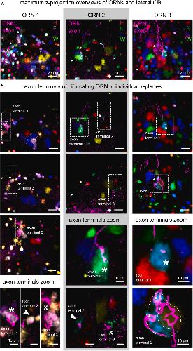 Figure 4. Axonal terminals of multi-glomerular ORNs can be associated with similarly tuned glomeruli (A) Maximum intensity projection of the lateral olfactory bulb showing three ORN axons (magenta) with terminals (arrowhead, asterisk, cross) connected to postsynaptic glomerular neuropil (color-coded by responsiveness to single amino acids, H, red; K, green; R, blue; W, yellow; F, gray). (B) Individual imaging planes of the surveyed volume with their axon terminals (arrowhead, asterisk, or cross) and associated glomeruli highlighted. Scale bar equals 25 µm. Lower panels show a higher magnification of axon terminals (dashed white rectangles). Scale bar equals 10 µm. |
