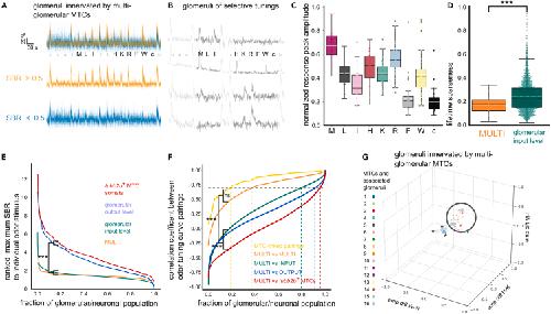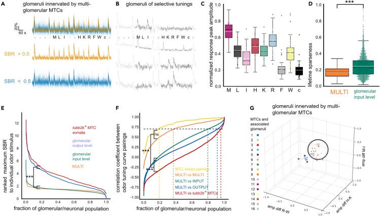 Figure 7. Glomerular inputs connected to multi-glomerular MTCs exhibit a broad underlying tuning profile(A) Overlay of odor responses of 42 glomeruli innervated by multi-glomerular MTCs (n = 16). Profiles are classified by their signal to background ratio (SBR; orange, SBR>0.5; blue, SBR<0.5). Response profiles show low amplitude responses to all amino acids applied except F.(B) Representative calcium time courses of glomerular input regions with selective tuning to individual amino acids.(C) Boxplots of amino acid response peak amplitudes of glomeruli innervated by multi-glomerular MTCs. Mean, dashed white line; median: black line; box outlines 1st and 3rd quartiles.(D) Boxplots of the lifetime sparseness of the MULTI dataset versus glomerular input level (green). Mean, dashed white line; median: black line; box outlines 1st and 3rd quartiles; ∗∗∗, p ≤ 0.001.(E) Ranked maximum SBR values to individual odor stimuli among multi-glomerular MTCs (MULTI, orange), glomerular input (green), output (blue), and MTC soma level (red). ∗∗∗, p ≤ 0.001.(F) Ranked distribution of correlation coefficients between all pairings of response peak amplitude vectors. Correlation coefficients were calculated for different datasets, i.e., glomeruli innervated by the same multi-glomerular MTC (MTC-linked), glomeruli of all multi-glomerular MTCs (MULTI), mixed glomerular input, output, and tubb2b+ MTCs. Dashed lines indicate Pearson’s correlation coefficient>0.7. ∗∗∗, p ≤ 0.001; ns, not significant, p > 0.05.(G) Glomeruli connected to multi-glomerular MTCs functionally cluster in a common region in odor space. Odor space is defined by relative amplitude differences between response to single amino acids. Note: Glomeruli of MTCs 1 and 2 (asterisks, see Figure 6) are outliers. See also Figure S7. |