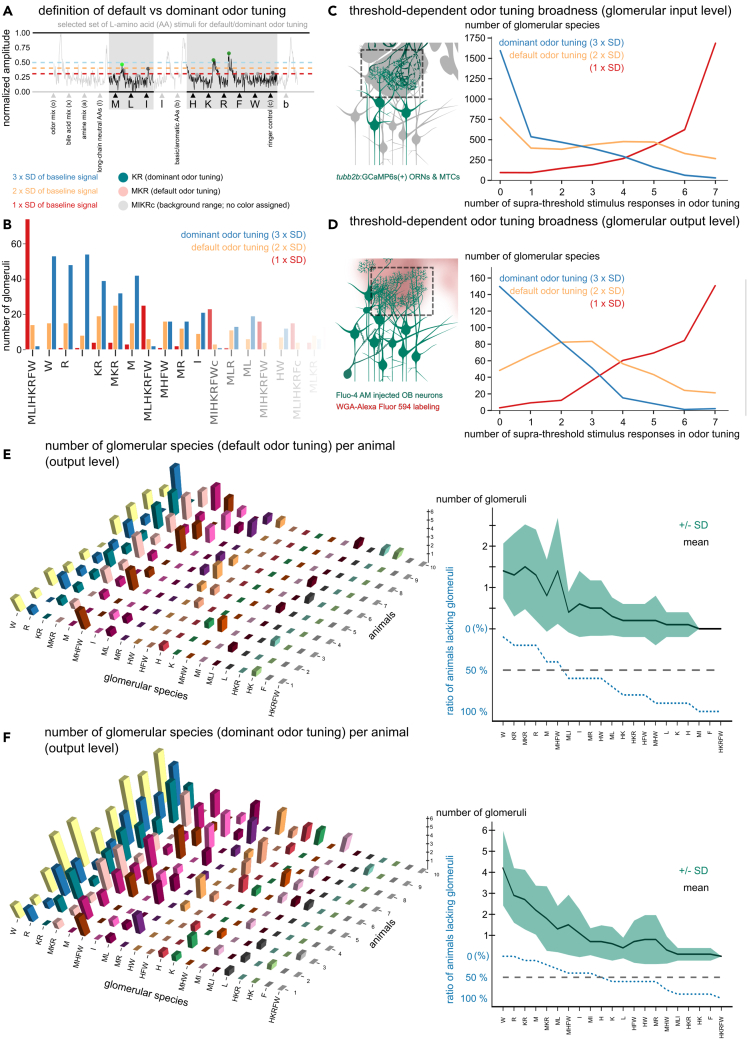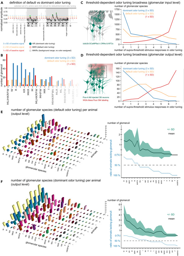 Figure 2. Glomeruli are dominantly tuned to a small set of structurally similar amino acid odors and are variably present in individual animals (A) Classification of odor tuning by amplitude thresholds. Calcium transients were normalized to the maximum amplitude of the experiment (in this case odorant mix: o). Responses to selected stimuli (gray rectangles) were considered, when the maximum amplitude in the stimulation interval (dots) exceeded twice the standard deviation of baseline fluorescence signal (all green dots, default odor tuning). Responses larger than triple the standard deviation were considered dominant (dark green dots, dominant odor tuning). Default/dominant odor tunings are written as sequence of the respective single amino acid code letters of all selected supra-threshold responses. (B) Frequency distributions of individual glomerular species are dependent on classification threshold. (C and D) Response-threshold dependent odor tuning broadness (number of selected stimuli causing supra-threshold responses) on the glomerular input and output level. (E and F) Presence of glomeruli with similar tuning in different individuals. 3D bar plots of glomerular species frequencies (left panels). Mean number of glomerular species ranked according to their occurrence in each animal (right panels). Many tuning profiles were not found in every individual (blue dotted line: ratio of animals lacking glomeruli). SD, standard deviation. Amino acid stimuli are represented with their capital, single letter code, mixtures of amino acids or other odorants with lowercase letters (b: basic-aromatic, s: short-chain neutral, l: long chain neutral amino acid mixtures; x: bile acid, a: amine; o: all odorants mixtures; c: frog ringer control). See also Figure S3. |