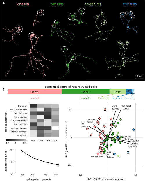 Figure 5. MTCs are morphologically heterogeneous, mainly classifiable by their glomerular wiring strategy(A) Representative reconstructions of labeled MTCs show variability in number of dendritic tufts (white dotted circles). Uni- and bitufted cells have the highest percentage share (pink, dark green), while multiple tufts are rarer. Scale bar equals 50 µm.(B) Principal component analysis (PCA) of nine morphological MTC characteristics. Heatmap of correlations of individual parameters with principal components (PC, gray; upper and lower left panel). Mapping of MTCs (circles) in PC1 and PC2 space. Colors represent the number of dendritic tufts (right panel). Eigenvectors are indicated as arrows. |