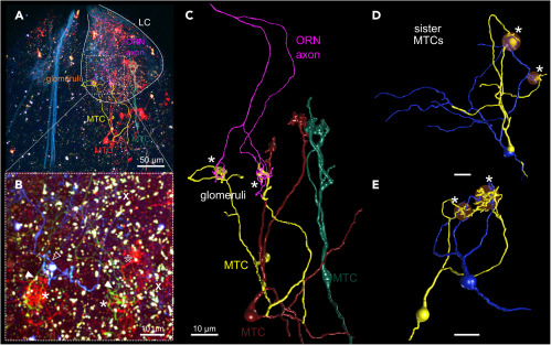 Figure 8. Multi-glomerular MTCs potentially re-converge input of anatomically distinct axon terminals of individual ORNs(A) Maximum intensity projection of the olfactory bulb with superimposed reconstructed ORN and MTC morphologies. In brainbow tadpoles, ORN axons that underwent CRE-mediated recombination are visible as green or cyan, fibrous structures. Scale bar equals 50 µm.(B) Close up of lateral glomerular cluster with colocalized axon terminals of a single ORN (green, arrowheads) and the two tufted dendrites of a single MTC (red, asterisks). Also visible are an additional, prominent ORN axon (cyan, empty arrowhead) and another tuft of a different MTC (empty asterisk). Note overrepresented autofluorescent, granular structures (white signal) due to contrast enhancement to visualize faint Cerulean and EYFP fluorescence. Scale bar equals 10 µm.(C) 3D reconstruction of an ORN (magenta) and an MTC (yellow) that innervate the same glomeruli with their two axon terminals/tufted dendrites and form a divergent-convergent glomerular module (pseudo-multiglomerular). Two additional labeled MTCs (red, green) are also shown. Scale bar equals 10 µm.(D and E) Reconstructions of multi-glomerular sister MTCs pairs (blue, yellow) that were labeled by sparse cell electroporation. They innervate the same set of glomeruli with their dendritic tufts (white asterisks). Note that glomeruli are sometimes very close and dendritic tufts are unequally arborized. Scale bar equals 10 µm. |