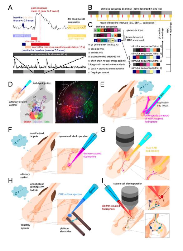 Figure S1. Schematics of experimental approaches, Related to Figure 1 (A) Parameters and intervals of the stimulation protocol/sequence. Odor stimulation of 5 s (light red) after a 15 s prestimulus interval (light blue). For intensity difference maps, the mean of five prestimulus baseline frames (dark blue; 5 s prior to stimulus onset) are subtracted from the mean of the peak response amplitude +/- 1 neighboring frame. For all other amplitude-based methods, the response peak amplitude is defined as the peak response found in the 15 s interval after stimulus onset (dark red). Baseline intervals for standard deviation or signal-to-background ratio are calculated from 15 s post response intervals (25 s after stimulus onset; calculated across multiple stimulus sequences). (B, C) Schematics of stimulus sequences (composed of seven unique stimuli, one respective odor mix application at beginning and end) used for the individual datasets. Amino acid stimuli used for analysis across datasets are highlighted by the black frames. The lower right schematic illustrates the number of stimulus sequences and trials used for glomerular or MTC recordings. (D) Multi-site Calcein AM dye injection into the MCL of the lateral OB (left panel). Colored circles represent differently colored dye reservoirs with overlapping areas. MTC dendritic staining depends on the position of the MTC soma and the ratio of the surrounding dyes. Example of multi-site Calcein dye injection with a lateral (red), intermedio-dorsal (blue) and medial (green) MTC population and their dendritic projection fields labeled (right panel). (E) Fluorophore-coupled wheat germ agglutinin (WGA) application into the nostril of anesthetized tadpoles with subsequent active uptake by ORNs and anterograde, axonal transport to the OB. (F) Single ORN electroporation with dextran-coupled fluorophores (magenta) in anesthetized tadpoles. (G) Fluo-4 AM dye bulk injection into MCL of the olfactory system explant (yellow) including individual labeled ORN axon (magenta). (H) CRE recombinase solution injection (blue) with subsequent bulk electroporation into the MOE of anesthetized, transgenic Brainbow tadpoles. (I) Sparse cell electroporation of MTCs with fluorophore-coupled dextrans (red). ORNs and their axons express the fluorescent proteins Cerulean (cyan) or EYFP (yellow) induced by prior CRE mRNA injection/electroporation. |