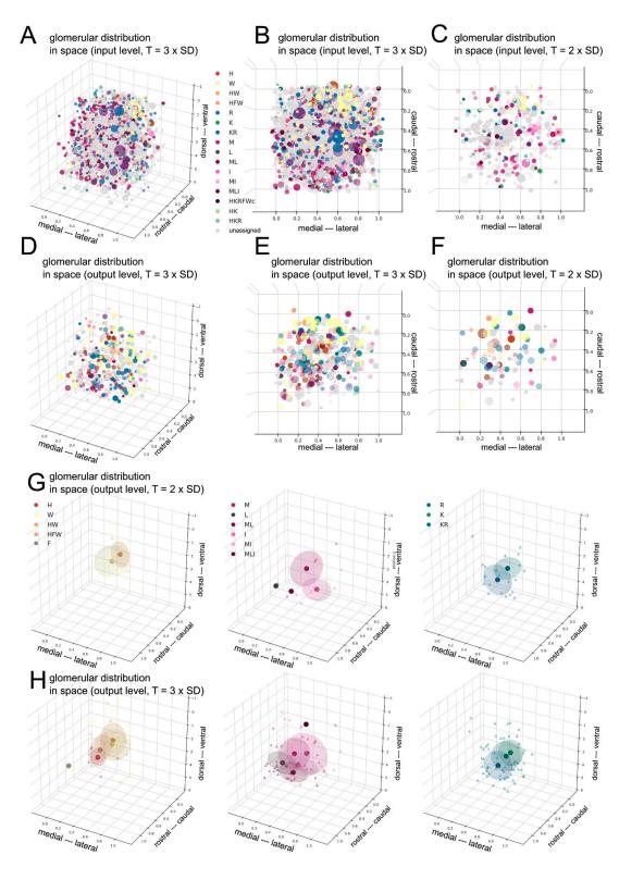 Figure S4. Overlapping but differential positioning of glomeruli with similarity in ligand specificity on the glomerular level, Related to Figure 3 (A–F) Positioning of glomeruli pooled from all animals on the glomerular input (A, B, C; n=17) and output level (D, E, F; n=10). A, D) 3D distribution of glomeruli (default / dominant odor tunings assigned as colors) along the medio-lateral, caudo-rostral, and ventro-dorsal axes. Distribution along the medio-lateral and dorsal axes of glomeruli of dominant (B, E) or default odor tuning (C, F). (G, H) 3D distribution of individual glomerular species (glomerular output level) grouped by their overarching selectivity to single or groups of structurally similar amino acids (left panels: aromatic amino acids H, F, W; middle panels; long-chain neutral amino acids M, L, I; right panels; basic amino acids K and R) along the mediolateral, rostro-caudal and dorso-ventral axes according to their default (G) or dominant odor tuning (H). Positional variability of the individual glomerular species plotted as an ellipse in the dimensions of the standard deviation from the centroid of the data points (darker shaded circle in respective color). T, threshold; SD, standard deviation. Default/dominant odor tunings are represented by individual colors and combinations of their single letter codes. |