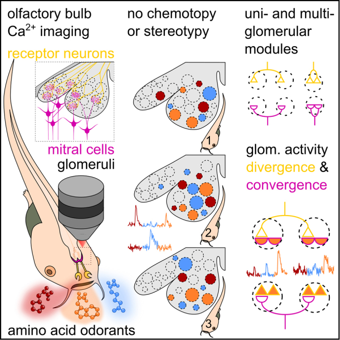 Glomeruli are the functional units of the vertebrate olfactory bulb (OB) connecting olfactory receptor neuron (ORN) axons and mitral/tufted cell (MTC) dendrites. In amphibians, these two circuit elements regularly branch and innervate multiple, spatially distinct glomeruli. Using functional multiphoton-microscopy and single-cell tracing, we investigate the impact of this wiring on glomerular module organization and odor representations on multiple levels of the Xenopus laevis OB network. The glomerular odor map to amino acid odorants is neither stereotypic between animals nor chemotopically organized. Among the morphologically heterogeneous group of uni- and multi-glomerular MTCs, MTCs can selectively innervate glomeruli formed by axonal branches of individual ORNs. We conclude that odor map heterogeneity is caused by the coexistence of different intermingled glomerular modules. This demonstrates that organization of the amphibian main olfactory system is not strictly based on uni-glomerular connectivity.