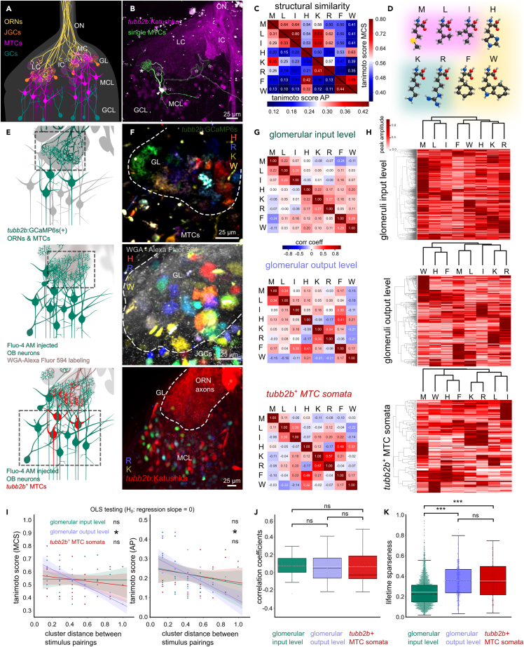 Figure 1. Feature selectivity to amino acids and lifetime sparseness increase from the glomerular input to the output level(A) Schematic of a main olfactory bulb (OB) hemisphere of larval Xenopus laevis. Olfactory receptor neuron axons (ORNs, yellow) incoming from the olfactory nerve (ON) form distinct medial (MC), intermediate (IC), and lateral (LC) clusters in the glomerular layer (GL). Dendrites of mitral/tufted cells (MTCs; magenta) and juxtaglomerular cells (JGCs, orange) make up the postsynaptic glomerular compartments. MTCs in the mitral cell layer (MCL) integrate odor information and convey it to higher brain centers after modulation by inhibitory granule cells (GCs, teal).(B) Katushka expression regulated by the tubb2b promoter in ORN axon terminals and a subpopulation of MTCs. Examples for uni-glomerular (filled symbols, arrowhead, soma; asterisk, dendritic tuft) and multi-glomerular tubb2b+ MTCs (empty symbols). Scale bar equals 25 µm.(C) Matrix of molecular Tanimoto similarity scores of amino acid stimuli (Capital letters represent single amino acid code; AP, atom pair; MCS, maximum common substructure).(D) Molecular structures of L-amino acid stimuli with structural similarity color-highlighted.(E) Experimental approaches to measure odor-induced activity on the glomerular input level (upper panel), the postsynaptic glomerular output level (middle panel), and MTC soma level (lower panel). Dashed boxes indicate area of investigation.(F) Fluorescence intensity difference maps of glomerular input (upper panel), output (middle panel), and MTC soma level activity (lower panel; H: red; K: green; R: blue; W: yellow; WGA: wheat germ agglutinin). Scale bar equals 25 µm.(G) Correlation matrices (Pearson’s correlation coefficient) of pooled response peak amplitude vectors of the glomerular input (upper panel), glomerular output (middle panel), and tubb2b+ MTC soma level (lower panel).(H) Hierarchical cluster analysis of response peak amplitude vectors of the glomerular input (upper panel), output (middle panel), and tubb2b+ MTC soma level (lower panel).(I) Normalized dendrogram column distance of stimulus pairings (cluster distance) plotted against Tanimoto similarity scores, MCS (left panel) and AP (right) for the input (green), output (blue), and tubb2b+ MTC level (red). Linear regressions and confidence intervals are indicated. Linear regressions between the two variables were negative and significantly different from a regression line of slope 0 (OLS testing) on the glomerular output level, only.(J) Distribution of population correlation coefficient values among the stimulus pairings (values from G).(K) Lifetime sparseness of glomerular input (green), output (blue), and tubb2b+ MTC soma level (red). Mean, dashed white line; median: black line; box outlines 1st and 3rd quartiles; ∗∗∗, p ≤ 0.001; ∗, p ≤ 0.05; ns, not significant, p > 0.05.See also Figures S1, S2 and S8. |
