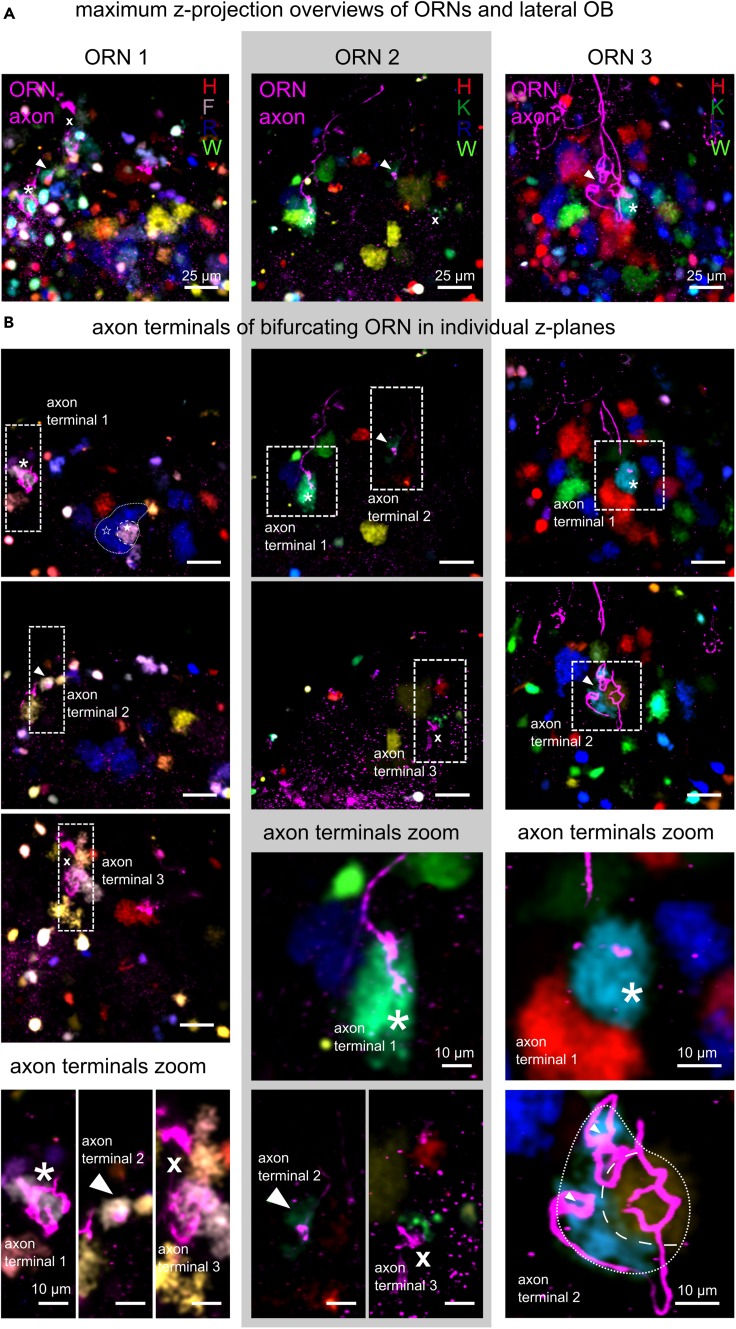 Figure 4. Axonal terminals of multi-glomerular ORNs can be associated with similarly tuned glomeruli(A) Maximum intensity projection of the lateral olfactory bulb showing three ORN axons (magenta) with terminals (arrowhead, asterisk, cross) connected to postsynaptic glomerular neuropil (color-coded by responsiveness to single amino acids, H, red; K, green; R, blue; W, yellow; F, gray).(B) Individual imaging planes of the surveyed volume with their axon terminals (arrowhead, asterisk, or cross) and associated glomeruli highlighted. Scale bar equals 25 µm. Lower panels show a higher magnification of axon terminals (dashed white rectangles). Scale bar equals 10 µm. |