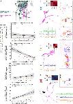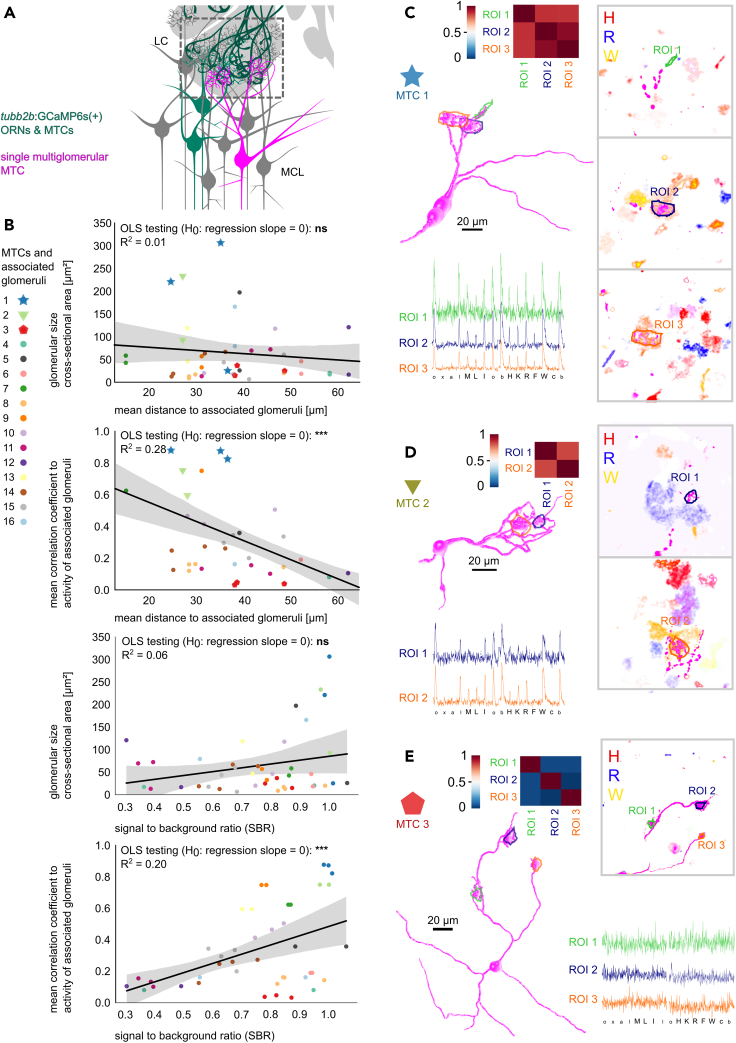 Figure 6. Positive correlation between activity patterns of glomeruli innervated by multi-glomerular MTCs decreases with inter tuft distance(A) Schematic of electroporation of a single, multi-glomerular MTC (magenta) in the lateral olfactory bulb of tubb2b:GCaMP6s tadpoles (dark green).(B) Scatterplots of properties of glomeruli associated with individual multi-glomerular MTCs (n = 16, color and symbols indicate MTCs). Shown are mean Euclidean distance of linked glomeruli plotted against the glomerular cross-sectional area and against the mean correlation coefficient between fluorescent time traces of connected glomeruli. Inverse relation between signal to background ratio and glomerular cross-sectional area or mean correlation coefficient between fluorescent time traces of connected glomeruli. Linear regression lines indicate negative or positive relations between the compared factors, gray shadings the confidence interval. ∗∗∗, p ≤ 0.001; ns, not significant, p > 0.05.(C–E) 3D Reconstructions representative for three types of multi-glomerular MTCs. Raw fluorescence traces of glomerular calcium responses (color indicates the region of interest), correlation matrices between the raw fluorescence traces (Pearson’s correlation coefficient) are shown. Inlays with individual image planes showing association of dendritic tufts (magenta) and reactive glomeruli (fluorescence intensity difference maps to amino acids, H, red; R, blue; W, yellow). Scale bar equals 20 µm. (C) A multi-glomerular MTC with highly correlated response profiles in glomerular regions. (D) MTC with similar odor tuning, but differences in lower amplitude responses. (E) MTC with no clear responses with amplitudes above noise level in the glomerular regions innervated by tufted dendrites (correlation coefficients around 0 between region time courses). Stimuli abbreviations see Figure 2A and methods section. |