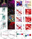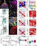 Figure 6. Positive correlation between activity patterns of glomeruli innervated by multi-glomerular MTCs decreases with inter tuft distance (A) Schematic of electroporation of a single, multi-glomerular MTC (magenta) in the lateral olfactory bulb of tubb2b:GCaMP6s tadpoles (dark green). (B) Scatterplots of properties of glomeruli associated with individual multi-glomerular MTCs (n = 16, color and symbols indicate MTCs). Shown are mean Euclidean distance of linked glomeruli plotted against the glomerular cross-sectional area and against the mean correlation coefficient between fluorescent time traces of connected glomeruli. Inverse relation between signal to background ratio and glomerular cross-sectional area or mean correlation coefficient between fluorescent time traces of connected glomeruli. Linear regression lines indicate negative or positive relations between the compared factors, gray shadings the confidence interval. ∗∗∗, p ≤ 0.001; ns, not significant, p > 0.05. (C–E) 3D Reconstructions representative for three types of multi-glomerular MTCs. Raw fluorescence traces of glomerular calcium responses (color indicates the region of interest), correlation matrices between the raw fluorescence traces (Pearson’s correlation coefficient) are shown. Inlays with individual image planes showing association of dendritic tufts (magenta) and reactive glomeruli (fluorescence intensity difference maps to amino acids, H, red; R, blue; W, yellow). Scale bar equals 20 µm. (C) A multi-glomerular MTC with highly correlated response profiles in glomerular regions. (D) MTC with similar odor tuning, but differences in lower amplitude responses. (E) MTC with no clear responses with amplitudes above noise level in the glomerular regions innervated by tufted dendrites (correlation coefficients around 0 between region time courses). Stimuli abbreviations see Figure 2A and methods section. |