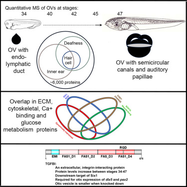 Xenopus larvae and tadpoles from stages 3447 were selected for otic proteome analysis. These stages were chosen because they include the simplest structure displaying onset of tubular duct growth (st 34), the initial polarization and compartmentalization of the OV into distinct functional regions and the appearance of otoliths (st 40), the onset of semicircular canal formation (st 42/43), the onset of sensory hair cell formation (st 45) and the completion of semicircular canal formation, sensory patch formation and hair cell differentiation (st 47). Insets show stage associated optical coherence tomography-based images of the otic vesicle. Otolith (o), pouch and protrusions for the horizontal canal (h), anterior canal (a), sacculus (s). Bar indicates 100 m. Otic vesicles were dissected and processed using a bottom-up proteomic workflow. Peptides were tagged with isobaric mass tags to quantify relative changes in protein abundances during the course of otic morphogenesis. Tagged peptides were fractionated offline using RP spin columns at a high pH and then analyzed by LC-HRMS. Quantification of select proteins was verified using targeted (PRM) HRMS.