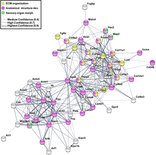 STRING analysis and pathway enrichment analysis using the Xenopus interaction database show enrichment of processes related to ECM organization (yellow), anatomical structure development (pink), and sensory organ development (green). Interactions among proteins are reported with medium to highest confidence represented by thickness of lines.
