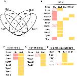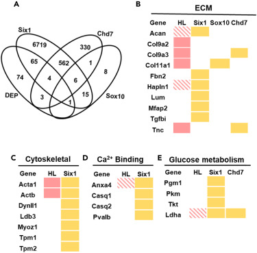 Figure 5. Dynamically expressed proteins overlap with putative downstream targets of CHL genes(A–E) (A) Venn diagrams show overlap between dynamically expressed proteins (DEPs) and BOR (Six1), CHARGE (Chd7) and Waardenburg (Sox10) associated genes (B–E) Dynamically regulated ECM (B), cytoskeletal (C), calcium binding (D), and glucose metabolism (E) proteins that are putative downstream targets of CHL genes. Filled pink boxes are based on human data whereas the hatched pink boxes are based on mouse knockout data. Yellow boxes indicate genes in these categories found in the datasets analyzed in A. See also Table S2.