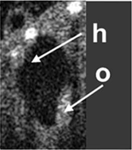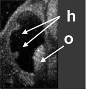 Optical coherence tomography-based images of the otic vesicle in X. laevis embryo at NF stage 42/43, containing pouches in the pars superior that presage the horizontal, anterior, and posterior semicircular canals. [key: Otolith (o), pouch and protrusions for the horizontal canal (h); scale bar =100um]