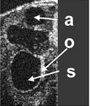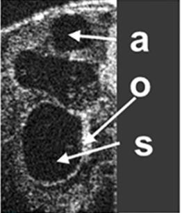 optical coherence tomography-based images of the otic vesicle in X. laevis embryo at NF stage 47, in which the axial protrusions are fused to form the horizontal, anterior, and posterior semicircular canals and the sensory patches in the sacculus, utricle, semicircular canals, and auditory lagena are recognizable and stereocilia bundles are established. [Key: Otolith (o), anterior canal (a), sacculus (s). Bar indicates 100 m]