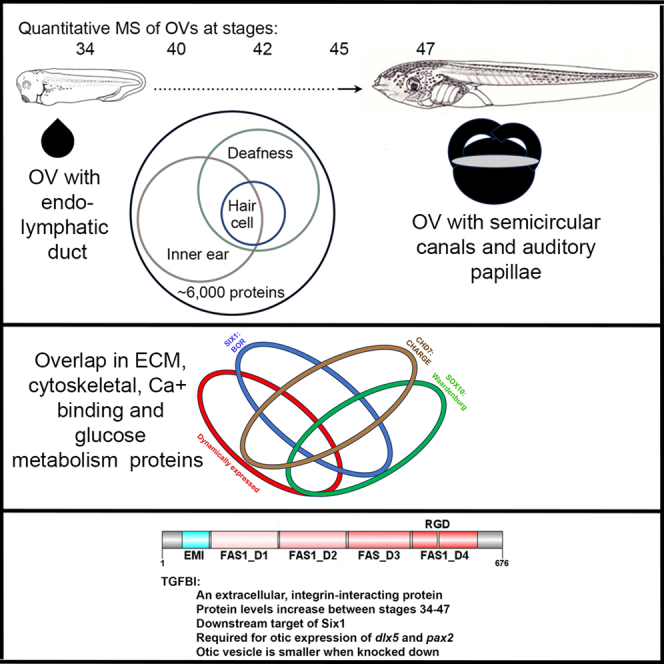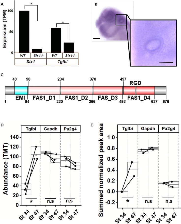 Figure 6. Characterization of Tgfbi expression(A) Tgfbi is a putative downstream target of Six1. RNA-seq of E10.5 mouse OVs from Six1+/+ and Six1−/− embryos was done to evaluate gene expression changes in the absence of Six1. Expression of Tgfbi significantly decreased in Six1-null OVs compared to wild type (WT) OVs of littermates (∗, p < 0.05).(B) Expression pattern of Tgfbi as assessed by in situ hybridization at stage 32 (lateral view). Bar indicates 200 μm. Inset shows Tgfbi expression in otic vesicle. Bar indicates 100 μm.(C) Xenopus laevis Tgfbi contains one EMI domain, four FAS1 domains and the RGD motif. (source Uniprot). Domain visualization generated using DOG (version 2).48 Numbers indicate amino acid residues.(D) Label based (TMT) abundance for Tgfbi, Gapdh, and Pa2g4 between stage 34 and 47 otic vesicles (paired Student’s t test for unequal variance, ∗, p < 0.05).(E) Summed and normalized peak intensities for Tgfbi, Gapdh, and Pa2g4 between stage 34 and 47 otic vesicles (paired Student’s t test for unequal variance, ∗, p < 0.05). n.s., not significant.