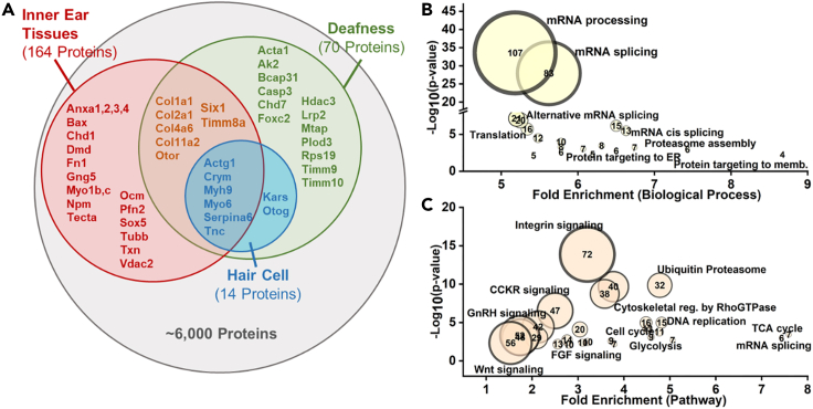 Figure 2. Characterization of the global proteome(A) Approximately 6,000 proteins were identified from otic tissues across all analyzed developmental stages and the five biological replicates. Proteins correlated with publicly available proteomic and transcriptomic datasets from inner ear tissues. A number of proteins previously reported in inner ear tissues (red) and hair cells (blue) were included in our dataset. Additional proteins correlated with deafness genes reported on OMIM (green).(B) Over-representation analysis (PantherDB) for biological processes demonstrating a fold enrichment >5 indicated an enrichment of processes such as mRNA processing and splicing in the otic proteome.(C) Over-representation analysis (PantherDB) for pathways demonstrated an enrichment in pathways such as Integrin, Wnt, and FGF signaling.